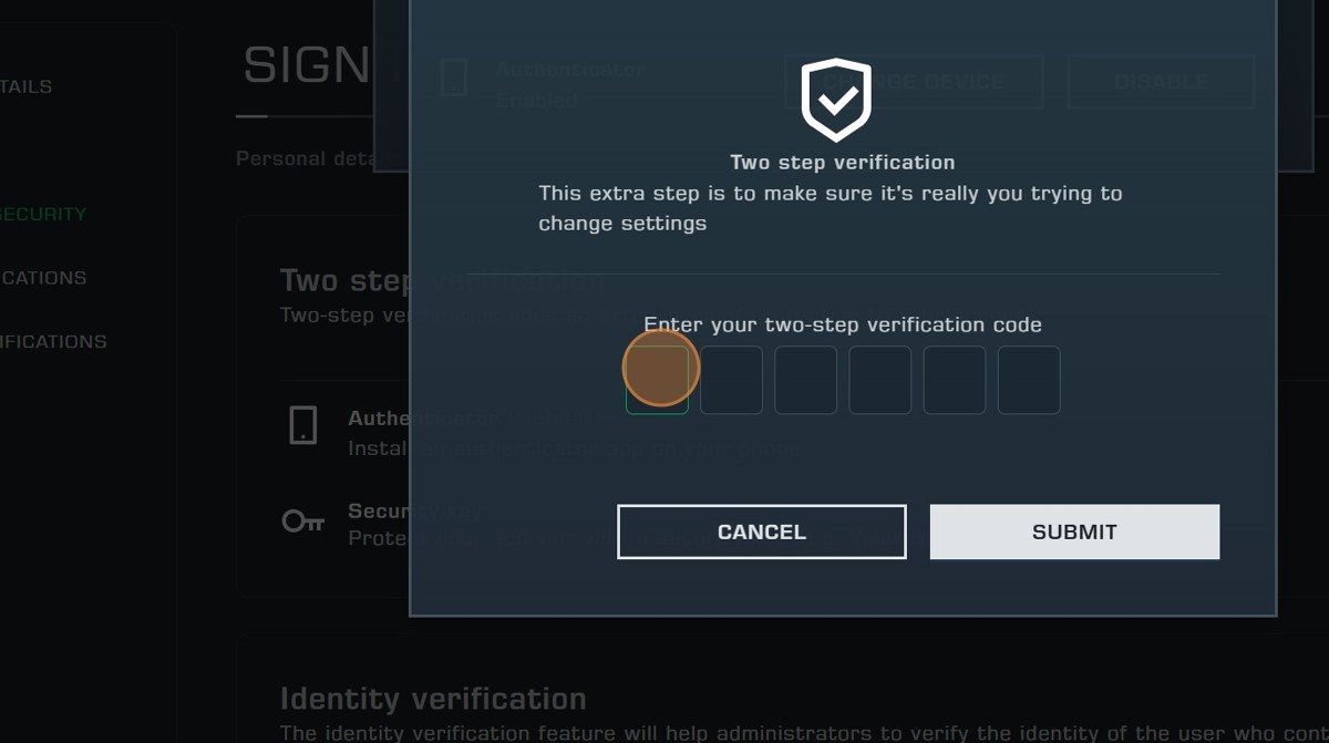 5. To change the authenticator device, enter the two-step verification code from the current authenticator.
