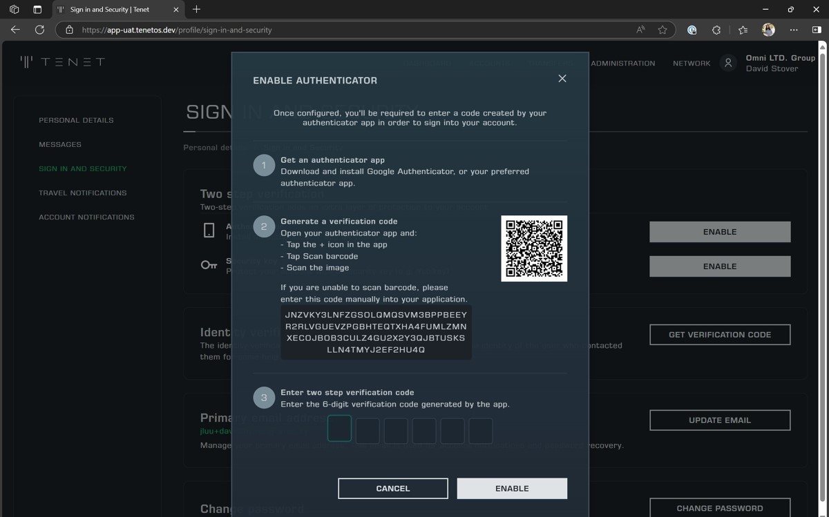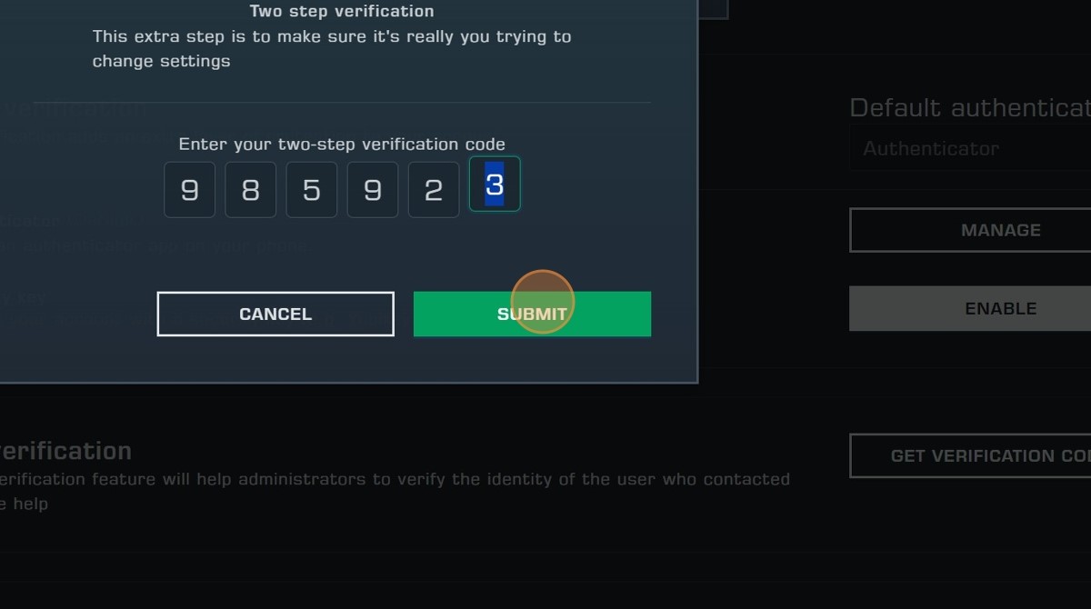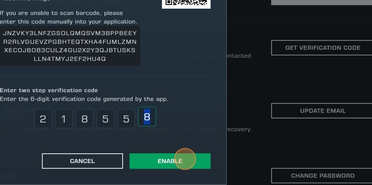 8. Enter the two step verification code provided by the new authenticator. Then, click on the “Enable” button to confirm the change.